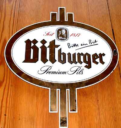 Bitburger große Variante des schönen Emailleschildes, 46 x 41 cm, schöne Farben und strahlendes Gold, schön emailliert, rückseitig mit Boss & Hahn bezeichnet, Zustand 1 120 Euro |
